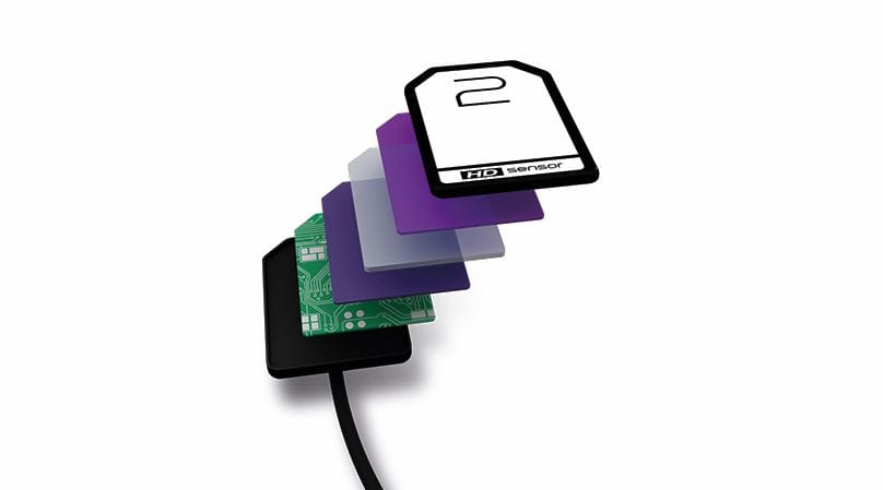 The high definition image capturing device with 20 µm, 14 bit cells (HD CMOS) converts light into a digital image, which is processed by the on-board electronics, ready to be transmitted to a USB port.