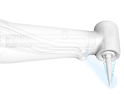 Accu-Spray Quattro Mix™ with dualook™ illumination Converges four asymmetrical laser-precise air/water sprays onto the tip of the bur for rapid and even cooling of the operative field. In combination with two multi-strand optical glass conductors, unobscured intraoral visibility is guaranteed