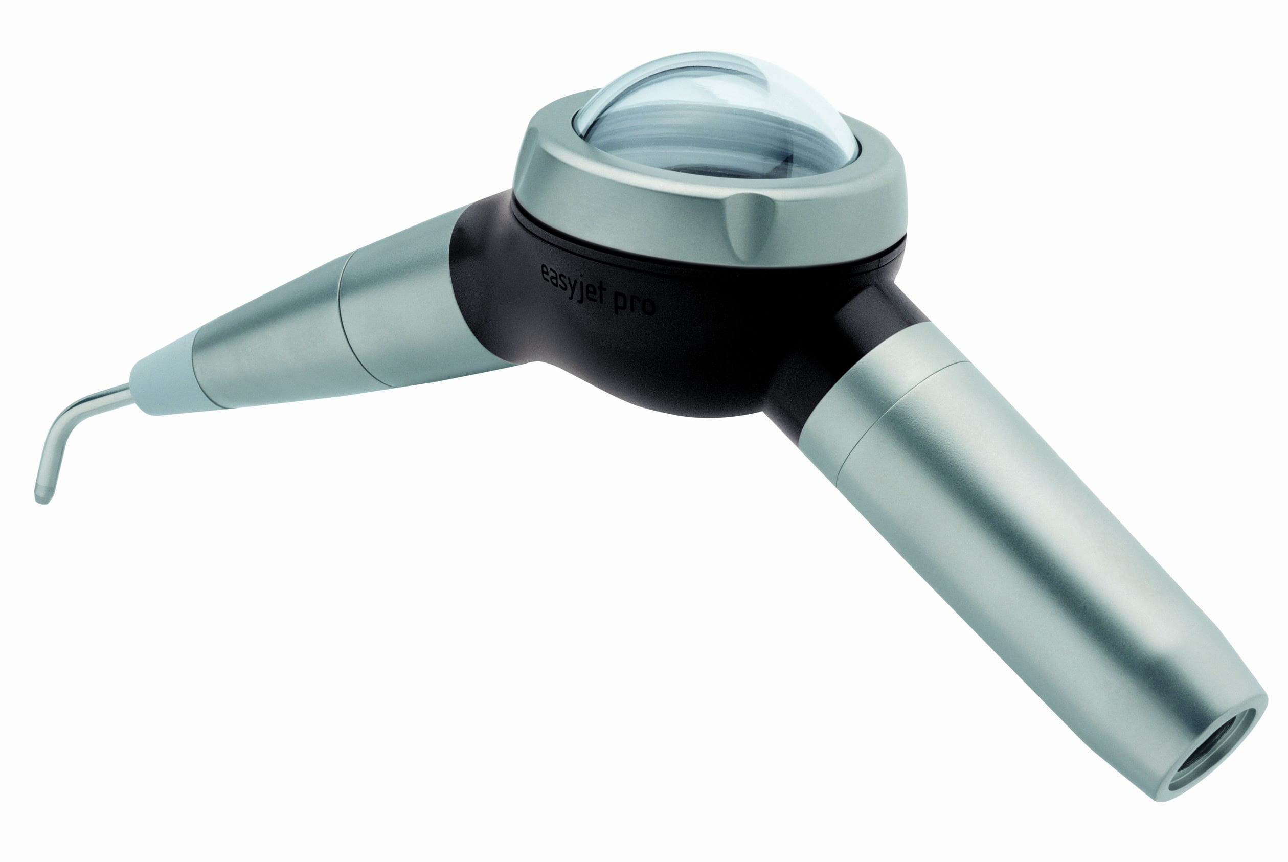 Dismountable powder chamber cap easy to connect, rotating spray hand piece fully sterilizable and with silicon protector